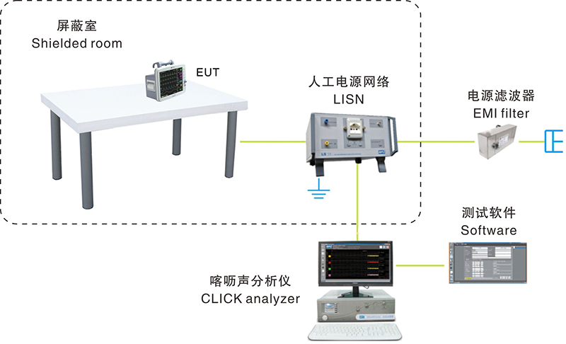 喀嚦聲屬于傳導(dǎo)騷擾測(cè)試,測(cè)試端口與傳導(dǎo)連續(xù)騷擾一致??陈暅y(cè)試需要哪些測(cè)試設(shè)備呢?下圖是我司推薦的喀嚦聲測(cè)試的標(biāo)準(zhǔn)方案,由于喀嚦聲測(cè)試對(duì)信號(hào)的采集、分析與連續(xù)騷擾不同,故常規(guī)的接收機(jī)已不能滿足喀嚦聲測(cè)試要求,這里我們就需要用到喀嚦聲分析儀。在耦合單元方面喀嚦聲測(cè)試與連續(xù)騷擾還是一致的,常規(guī)電源端口使用LISN,信號(hào)端、負(fù)載端和高壓大電流電源端使用電壓探頭。測(cè)試環(huán)境需要使用屏蔽室環(huán)境。