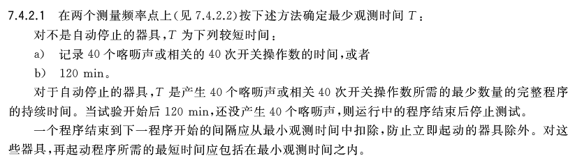 標(biāo)準(zhǔn)上根據(jù)設(shè)備的運(yùn)行狀態(tài),將設(shè)備分為兩類:一種是一直運(yùn)行的設(shè)備,另一種是自動(dòng)停止的設(shè)備。當(dāng)設(shè)備是一直運(yùn)行的設(shè)備如冰箱,當(dāng)設(shè)備運(yùn)行120min還未觀測(cè)到40個(gè)喀嚦聲或者40次開(kāi)關(guān)次數(shù),則測(cè)試停止,或者在120min中之內(nèi)也觀測(cè)到40個(gè)喀嚦聲或者40次開(kāi)關(guān)次數(shù),則測(cè)試停止。當(dāng)設(shè)備是自動(dòng)停止的設(shè)備如洗衣機(jī),判定依據(jù)還是一致的,我們需要保證觀測(cè)時(shí)間內(nèi)包含最小數(shù)量的完整程序且一個(gè)程序結(jié)束和下一個(gè)程序開(kāi)始的間隔是需要扣除的。